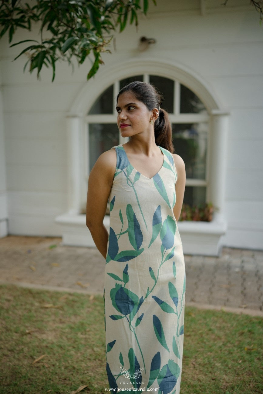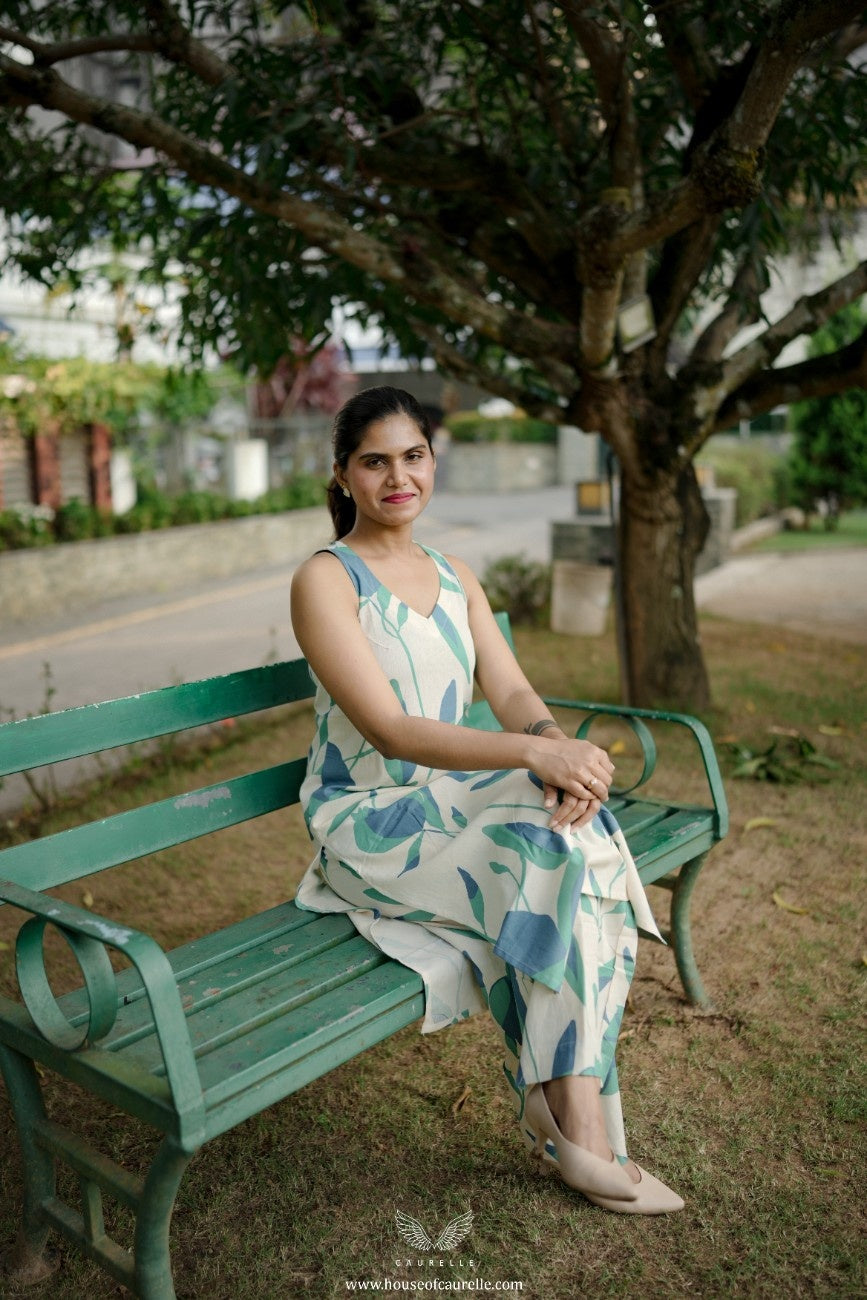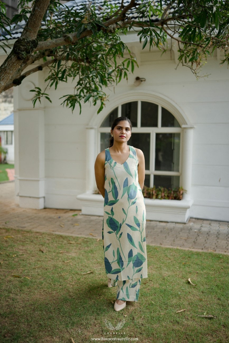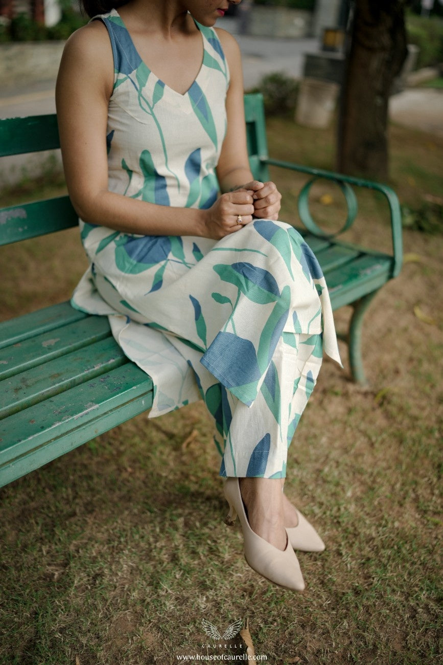 Fresh, serene, and effortlessly elegant, this sleeveless kurta set is designed for everyday ease with a soft, contemporary charm. Crafted on a gentle white base, it features an all over botanical print in soothing shades of blue and green, creating a calm, nature inspired aesthetic. The clean V-neckline and straight silhouette lend a flattering, relaxed shape that feels timeless and easy to wear.